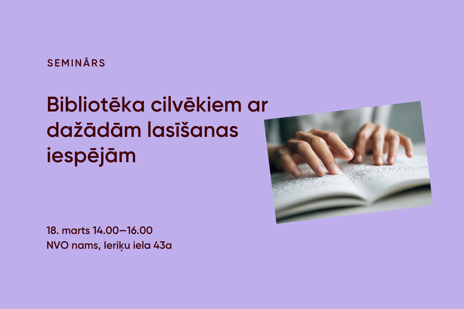 Laura Apkalne2026-03-09 11:16:042026-03-09 11:16:04NVO nams aicina piedalīties klātienes seminārā “Bibliotēka cilvēkiem ar dažādām lasīšanas iespējām. Tu vari! Mēs parādīsim, kā”