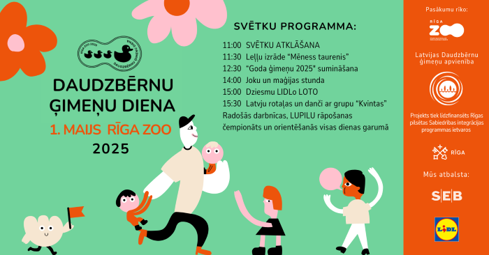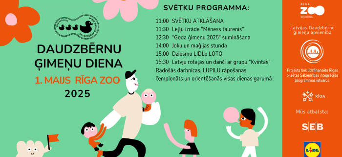 1. maijā Rīga jau trešo gadu pulcinās simtiem daudzbērnu ģimeņu no visiem Latvijas nostūriem. Latvijas Daudzbērnu ģimeņu apvienība sadarbībā ar Rīgas kapitālsabiedrību “Rīgas Nacionālais zooloģiskais dārzs” aicinājusi Rīgas Zoodārzā svinēt Daudzbērnu ģimeņu dienu. Latvijas Daudzbērnu ģimeņu apvienība aicina sabiedrību kopt Daudzbērnu ģimeņu dienas svinēšanas tradīciju, godinot sev blakus esošās kuplās ģimenes.