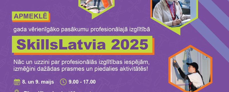 8. un 9. maijā Ķīpsalas izstāžu centrā norisināsies nacionālā jauno profesionāļu meistarības konkursa SkillsLatvia 2025 fināls, kurā 129 konkursanti no 30 profesionālās izglītības iestādēm demonstrēs savas zināšanas un prasmes 20 dažādos prasmju konkursos. Pasākumā klātienē aicināts piedalīties ikviens interesents, īpaši skolēni, jo paralēli sacensībām norisināsies virkne aktivitāšu, kas sniegs iespēju iepazīties ar profesionālās izglītības iestāžu piedāvājumu Latvijā, izzināt un izmēģināt dažādas profesijas un iesaistīties izzinošās un aizraujošās aktivitātēs.