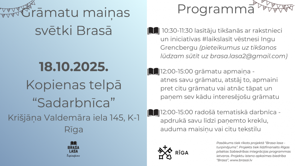 Pasākums tiek rīkots projektā “Brasa lasa – turpinājums”. Projekts tiek līdzfinansēts Rīgas pilsētas Sabiedrības integrācijas programmas ietvaros.