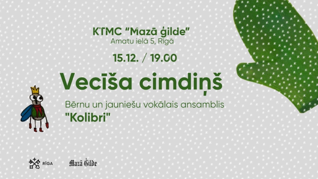 Pirmdien, 15. decembrī, plkst. 19.00, KTMC “Mazā ģilde” Lielajā zālē būs skatāma koncertizrāde, kas veidota pēc latviešu tautas pasakas “Vecīša cimdiņš” motīviem. Sirsnīgā un daudzu paaudžu iemīļotā pasaka jaunā interpretācijā ļaus skatītājiem un koncerta dalībniekiem iejusties sirsnīgā un jautrā Ziemassvētku vakarēšanas noskaņā – pasaku stāstīšanā un kopīgā Ziemassvētku dziesmu dziedāšanā.