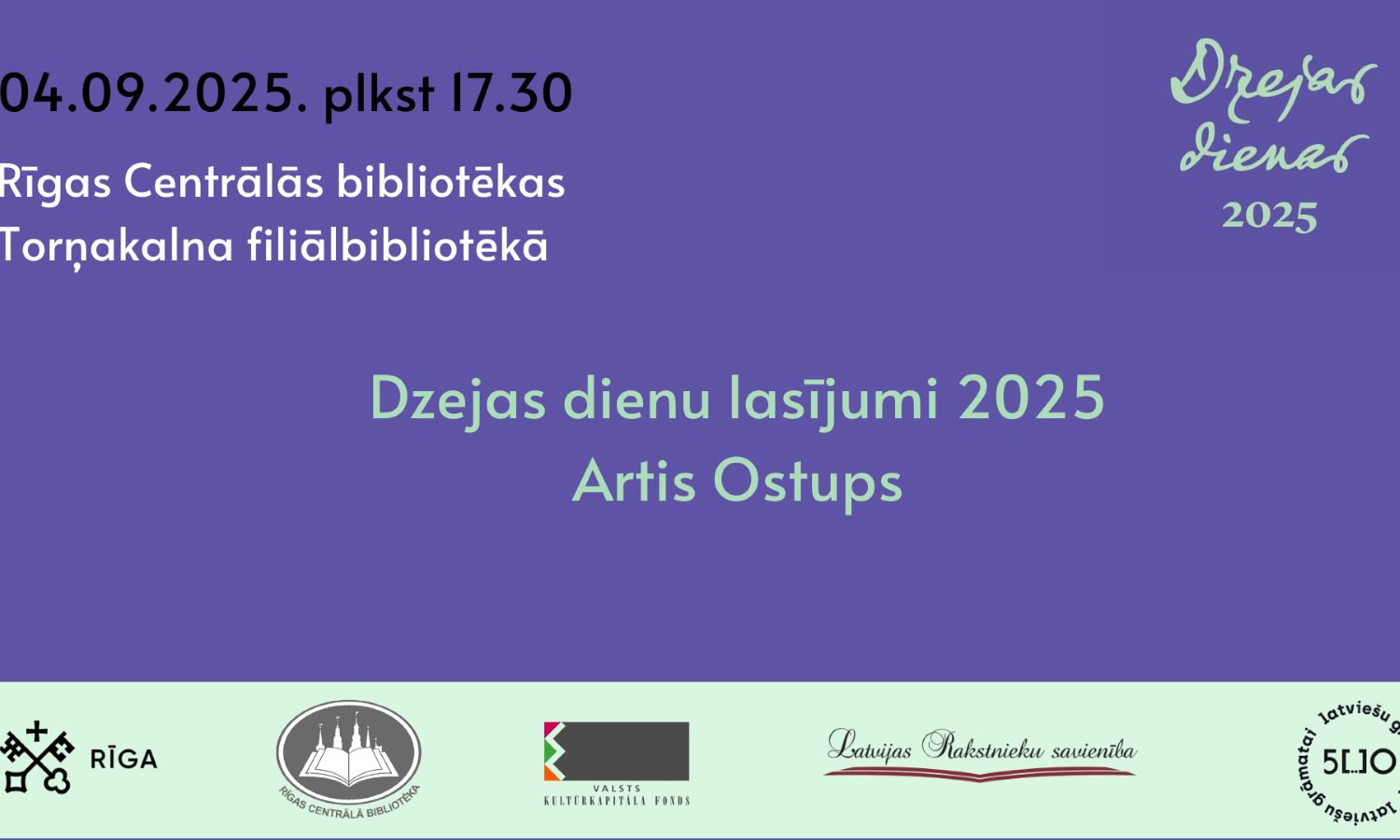 Latvijas Rakstnieku savienība sadarbībā ar Rīgas Centrālo bibliotēku rīko virkni pasākumu, lai atzīmētu Dzejas dienas 2025. 4. septembrī plkst. 17.30 RCB Torņakalna filiālbibliotēkā (Ojāra Vācieša ielā 2) uz lasījumu aicinās dzejnieks Artis Ostups.