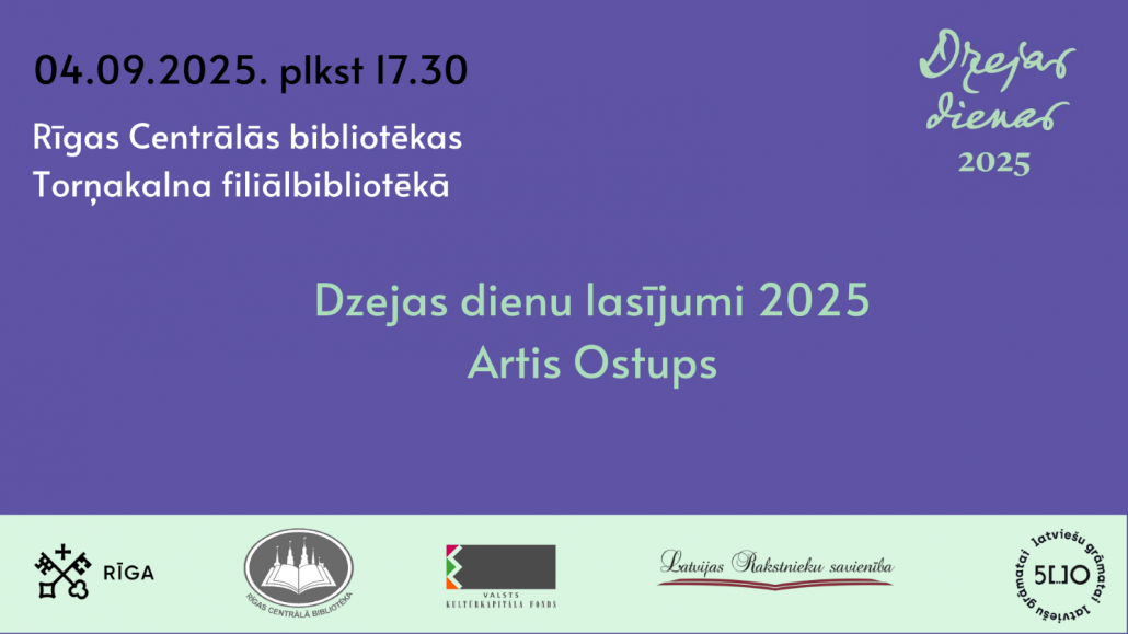 Latvijas Rakstnieku savienība sadarbībā ar Rīgas Centrālo bibliotēku rīko virkni pasākumu, lai atzīmētu Dzejas dienas 2025. 4. septembrī plkst. 17.30 RCB Torņakalna filiālbibliotēkā (Ojāra Vācieša ielā 2) uz lasījumu aicinās dzejnieks Artis Ostups.
