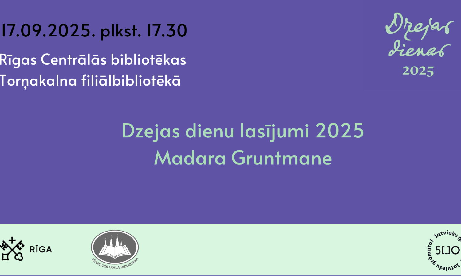 Rīgas Centrālā bibliotēka aicina kopā atzīmēt Dzejas dienas 2025. 17. septembrī plkst. 17.30 RCB Torņakalna filiālbibliotēkā (Ojāra Vācieša ielā 2) uz lasījumu aicinās dzejniece Madara Gruntmane, bet 18. septembrī plkst. 17.30 RCB Āgenskalna filiālbibliotēkā (Eduarda Smiļģa ielā 46) – dzejniece Iveta Ratinīka.