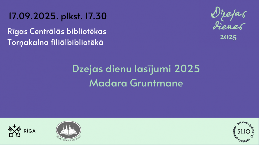 Rīgas Centrālā bibliotēka aicina kopā atzīmēt Dzejas dienas 2025. 17. septembrī plkst. 17.30 RCB Torņakalna filiālbibliotēkā (Ojāra Vācieša ielā 2) uz lasījumu aicinās dzejniece Madara Gruntmane, bet 18. septembrī plkst. 17.30 RCB Āgenskalna filiālbibliotēkā (Eduarda Smiļģa ielā 46) – dzejniece Iveta Ratinīka.