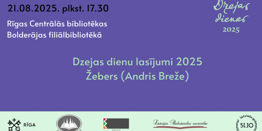 Latvijas Rakstnieku savienība sadarbībā ar Rīgas Centrālo bibliotēku rīko virkni pasākumu, lai atzīmētu Dzejas dienas 2025. Dzejas lasījumus uzsāksim 21. augustā plkst. 17.30 RCB Bolderājas filiālbibliotēkā (Gaigalas ielā 3), kur uz lasījumu aicinās dzejnieks Andris Breže, kurš pazīstams ar literāro pseidonīmu Žebers.