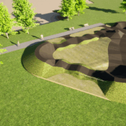 Rotaļu laukums veidots tā, lai tas saplūstu ar apkārtni – ir izmantots koks un seguma materiāli, kas ir tuvi meža videi. Bērniem ir pieejami slidkalniņš, šūpoles ar ligzdu, vingrošanas komplekss, karuselis un šūpuļtīkli.
