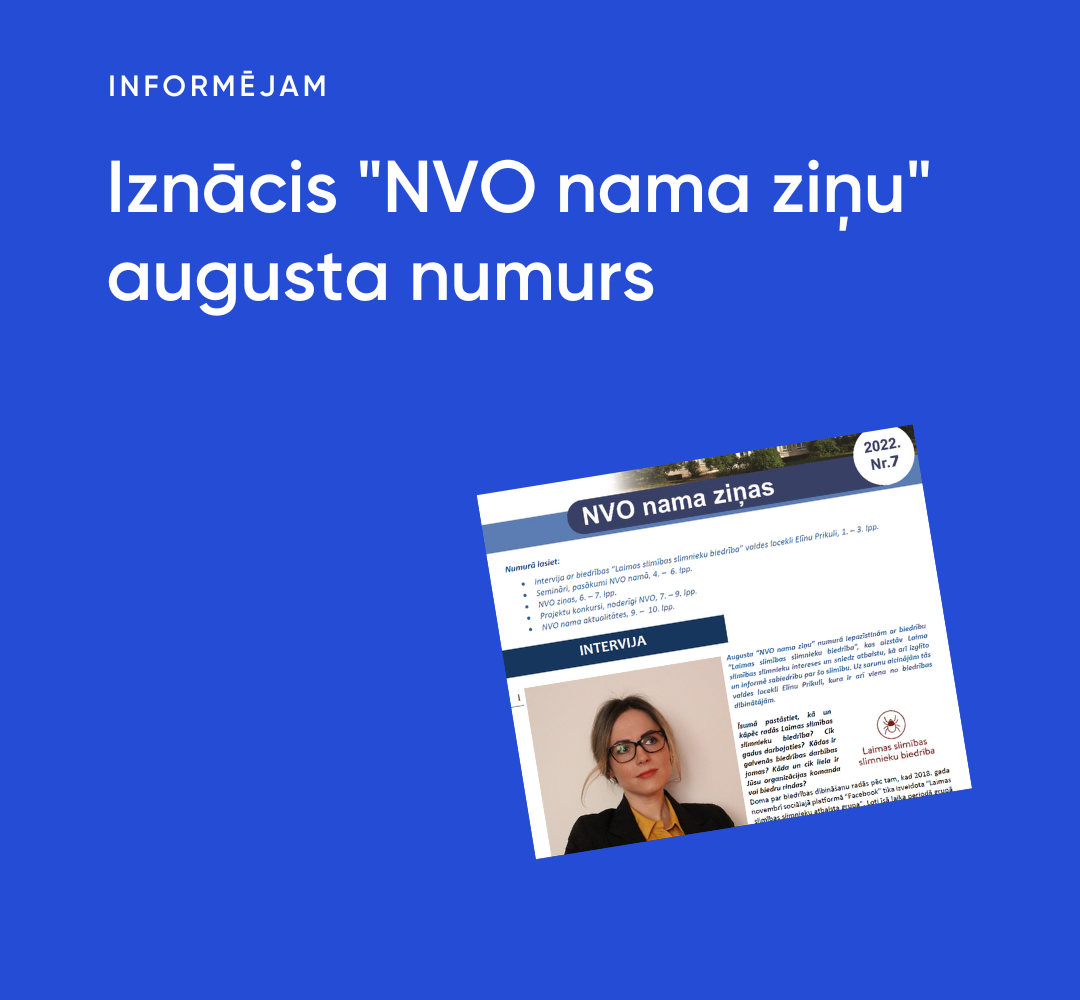 Augusta “NVO nama ziņu” numurā aicinām iepazīties ar biedrību “Laimas slimības slimnieku biedrība”, kas aizstāv Laima slimības slimnieku intereses un sniedz atbalstu, kā arī izglīto un informē sabiedrību par šo slimību.…
