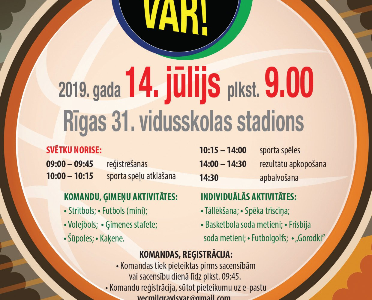 14. jūlijā no plkst. 9.00 Rīgas 31. vidusskolas stadionā notiks Vecmīlgrāvja sporta spēles “Vecmīlgrāvis VAR!”