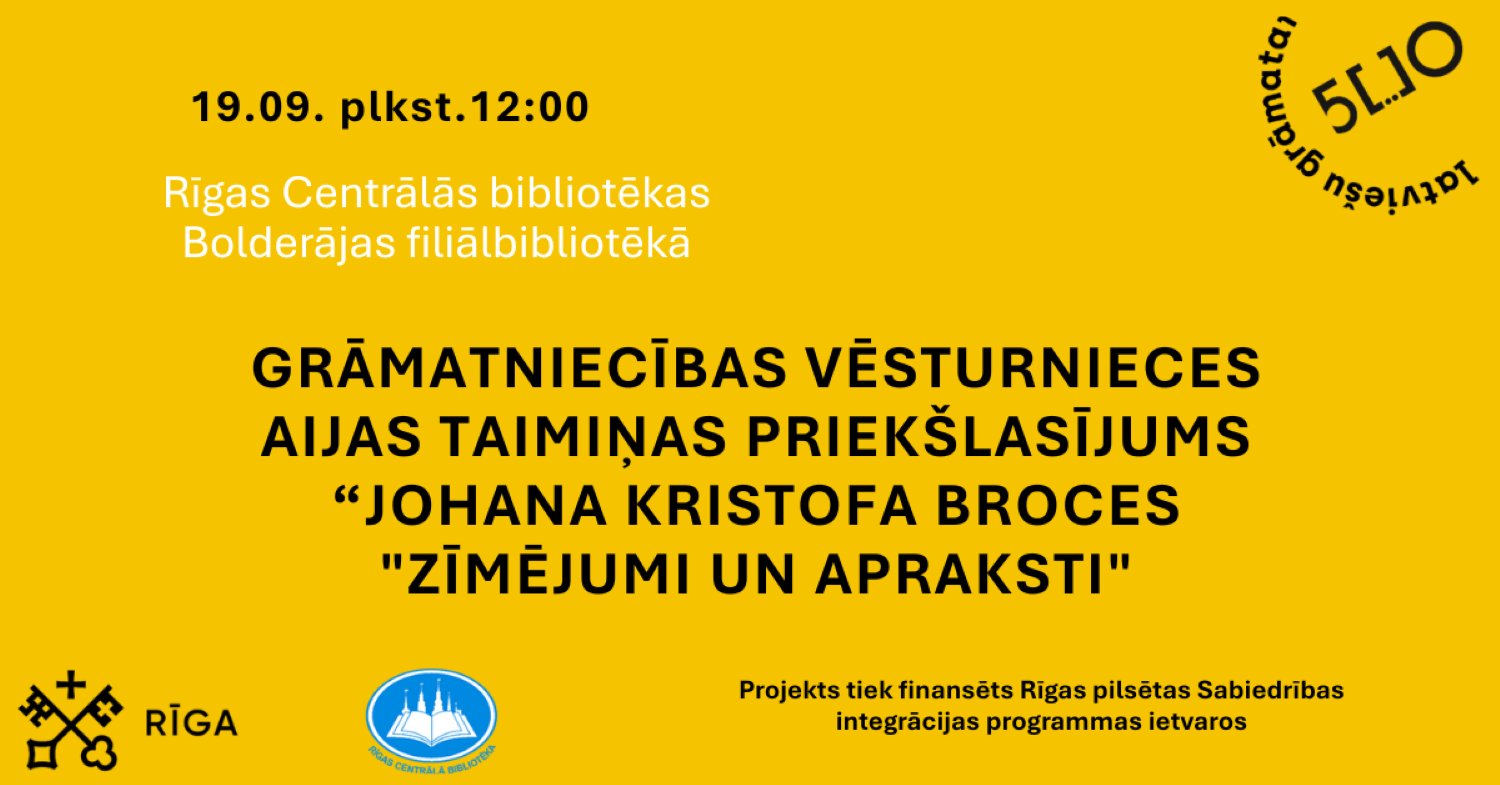 Ar Dr. philol., Latvijas Universitātes Akadēmiskās bibliotēkas pētnieces Aijas Taimiņas priekšlasījumu “Johana Kristofa Broces “Zīmējumi un apraksti” noslēdzas Sabiedrības integrācijas projekta “Grāmata svētkus svin!” īstenošana RCB Bolderājas filiālbibliotēkā.