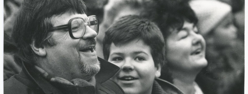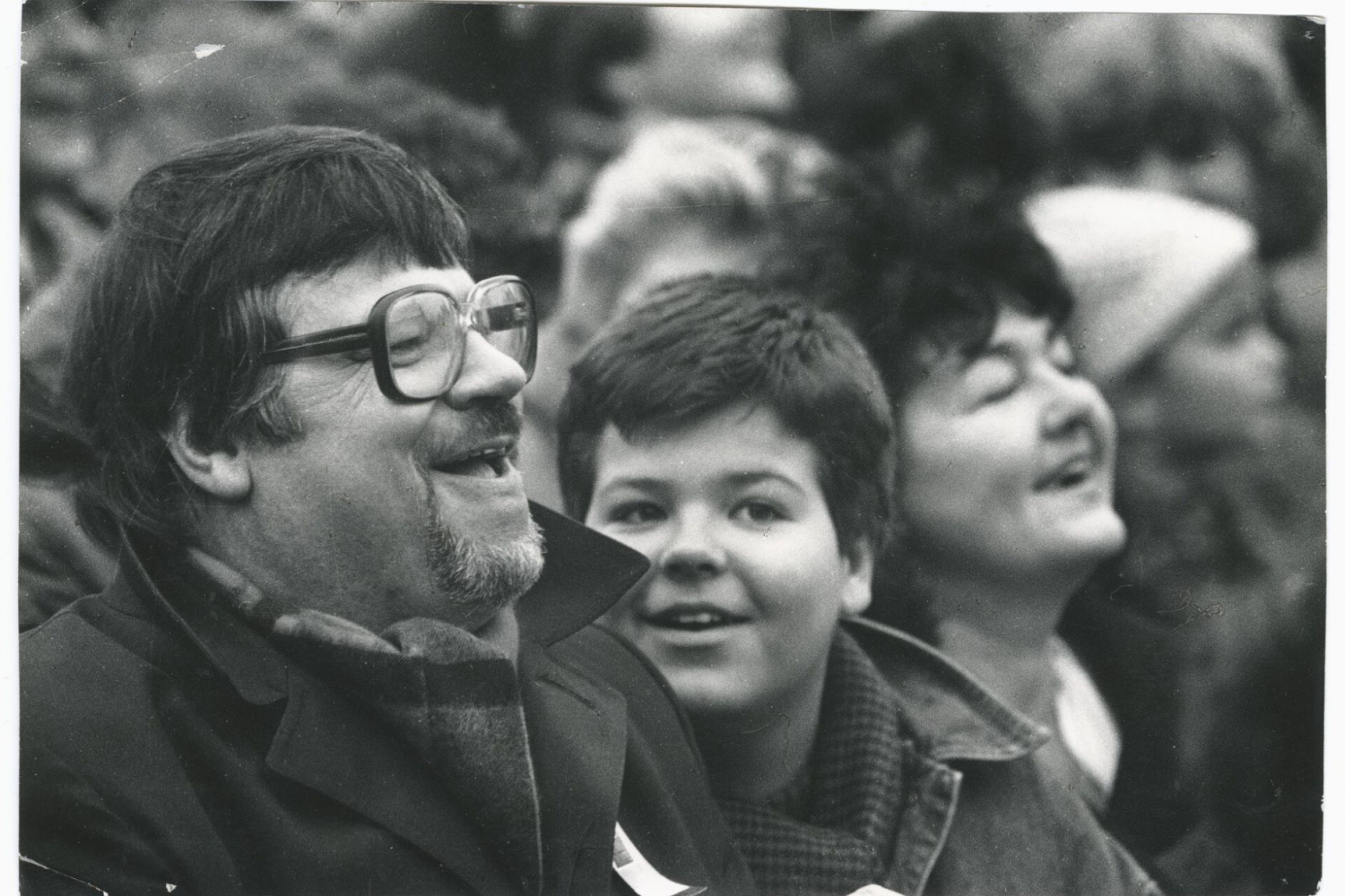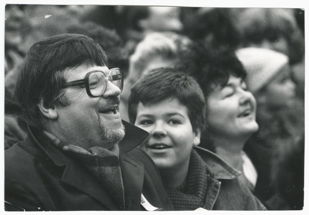Latviešu dzejnieks, sabiedrisks darbinieks Jānis Peters ar dēlu Krišjāni un sievu Baibu Dziesmu svētkos. Rīga, 1985.-1989. gads, autors Uldis Briedis (Matīss Pērkons)_Latvijas Nacionālais arhīvs