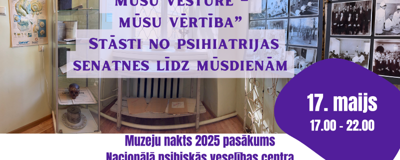 Sestdien, 2025. gada 17. maijā, Tvaika ielā 2 no plkst. 17.00 līdz 22.00 Nacionālais psihiskās veselības centrs (NPVC) aicina apmeklēt Muzeju nakts pasākumu ar devīzi “Mūsu vērtību stāsti”. Šī gada tēma – “Mūsu vēsture – mūsu vērtība” – ļaus ielūkoties psihiatrijas un garīgās veselības aprūpes vēsturē no tās pirmsākumiem līdz mūsdienām.