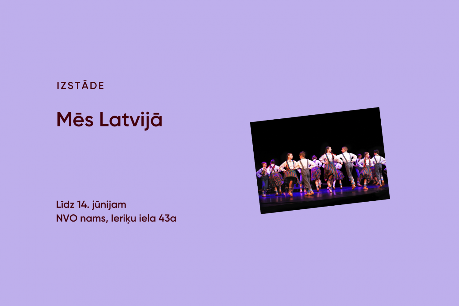 Līdz 14. jūnijam NVO nama 2. stāva gaitenī skatāma fotogrāfiju izstāde “Mēs Latvijā”. Izstāde ir iespēja ielūkoties krāsainā un iedvesmojošā notikuma – 9. maijā kultūras pilī “Ziemeļblāzma” izskanējušā konkursa-festivāla “Mēs Latvijā” – fotomirkļos.