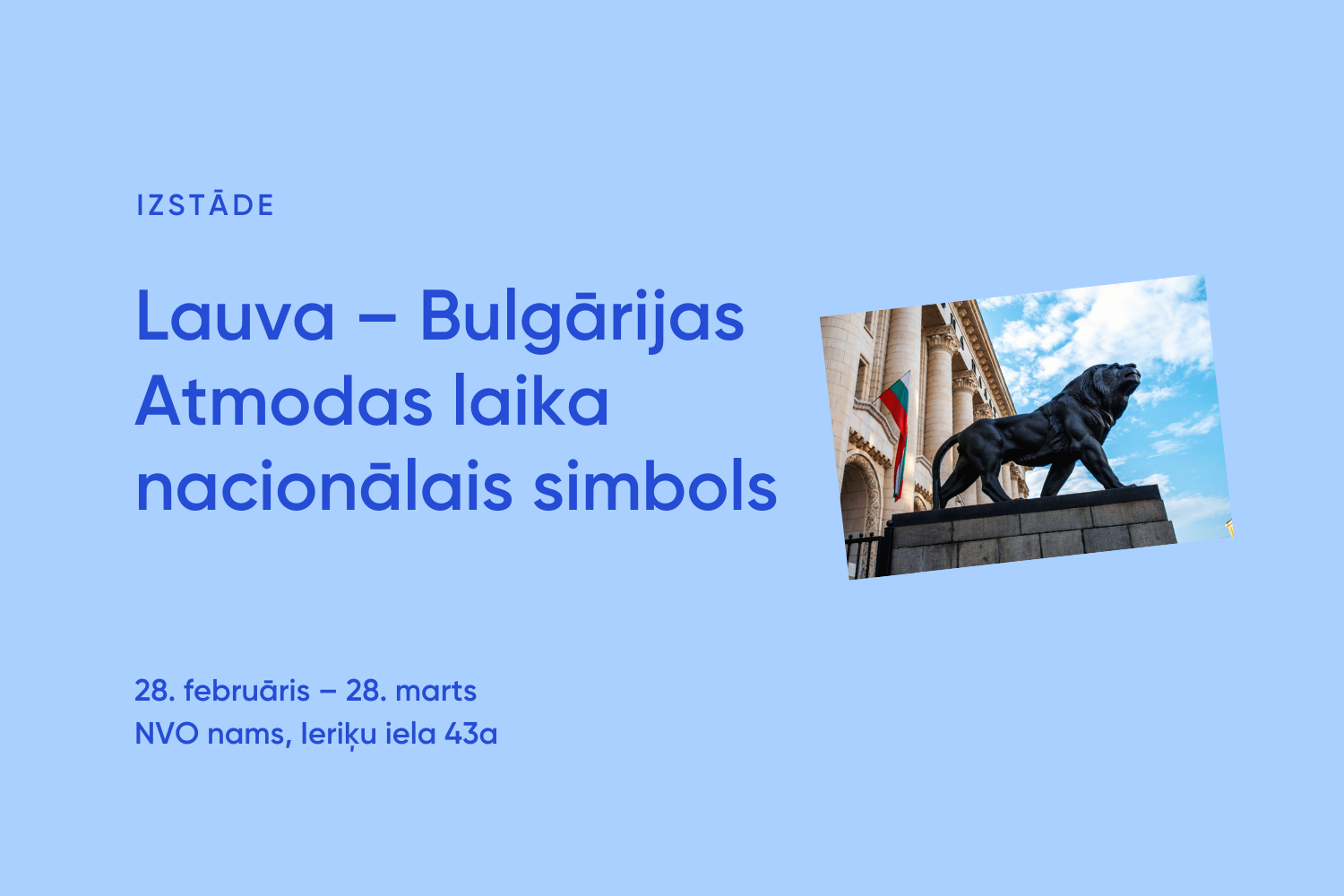 Līdz 28. martam NVO namā (Ieriķu ielā 43a, Rīgā) 1. un 2. stāva gaitenī apskatāma ceļojošā izstāde “Lauva – Bulgārijas Atmodas laika nacionālais simbols”, ko organizē “Kirila un Metodija” Latvijas bulgāru kultūras biedrība.