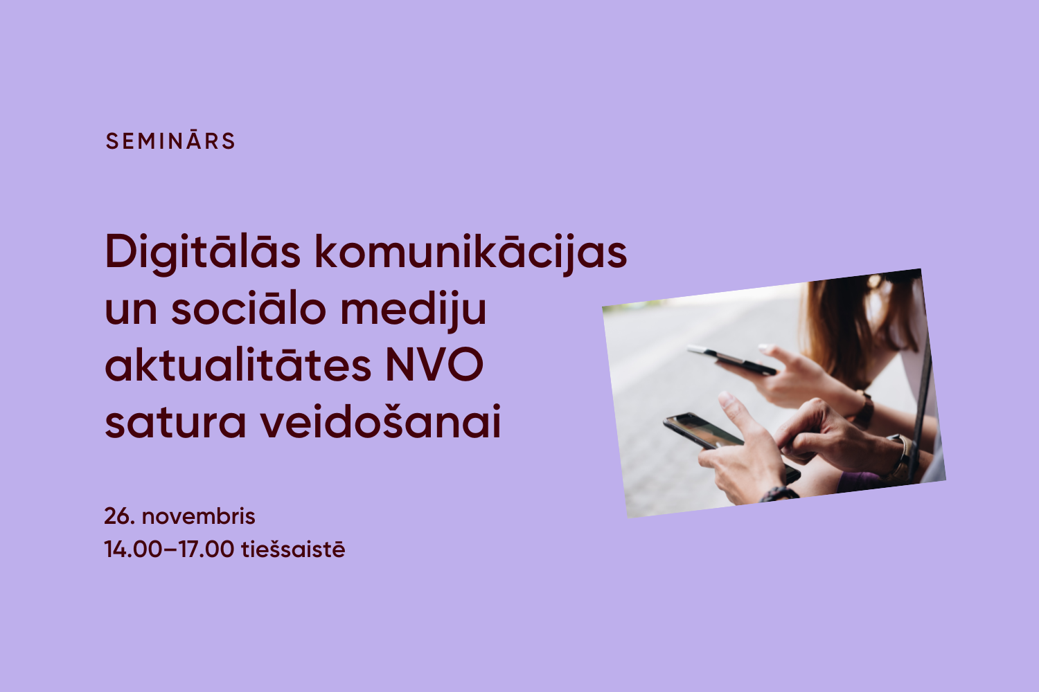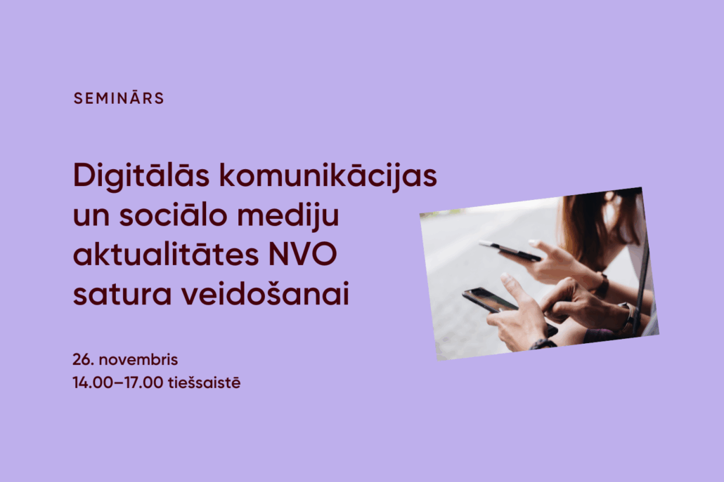 NVO nams aicina Rīgas nevalstisko organizāciju – biedrību un nodibinājumu – pārstāvjus pieteikties tiešsaistes semināram “Digitālās komunikācijas un sociālo mediju aktualitātes NVO satura veidošanai”, kas notiks 2025. gada 26. novembrī plkst. 14.00-17.00.