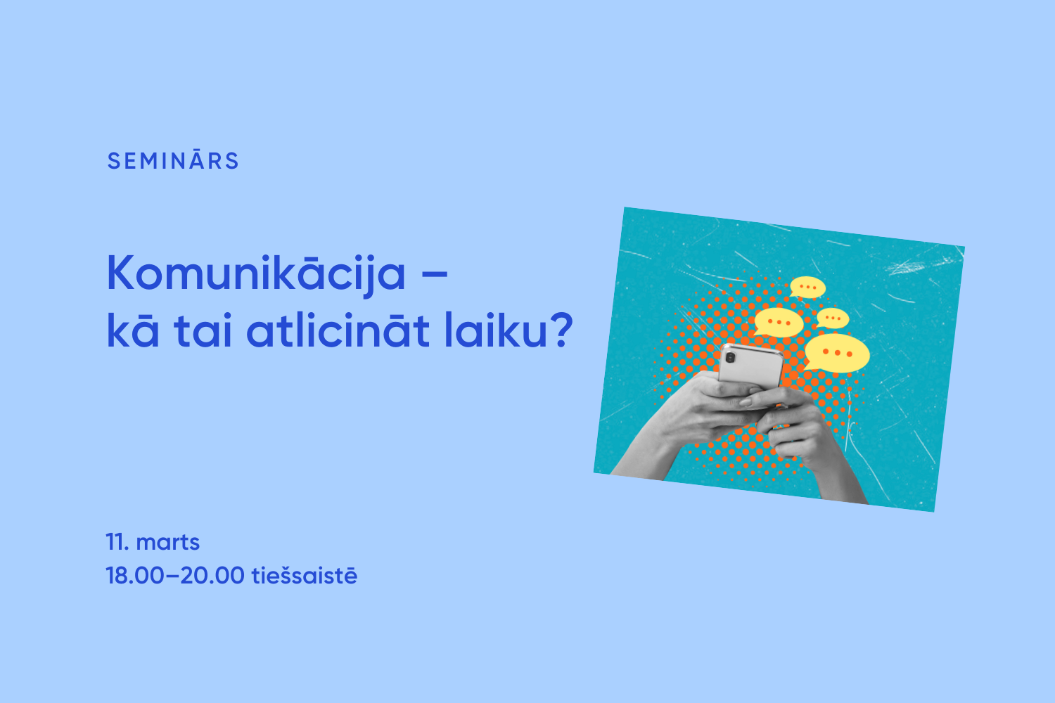RīgaNVO nams aicina Rīgas nevalstisko organizāciju – biedrību un nodibinājumu – pārstāvjus pieteikties tiešsaistes semināram “Komunikācija – kā tai atlicināt laiku?”, kas notiks 2026. gada 11. martā no plkst. 18.00 līdz 20.00.