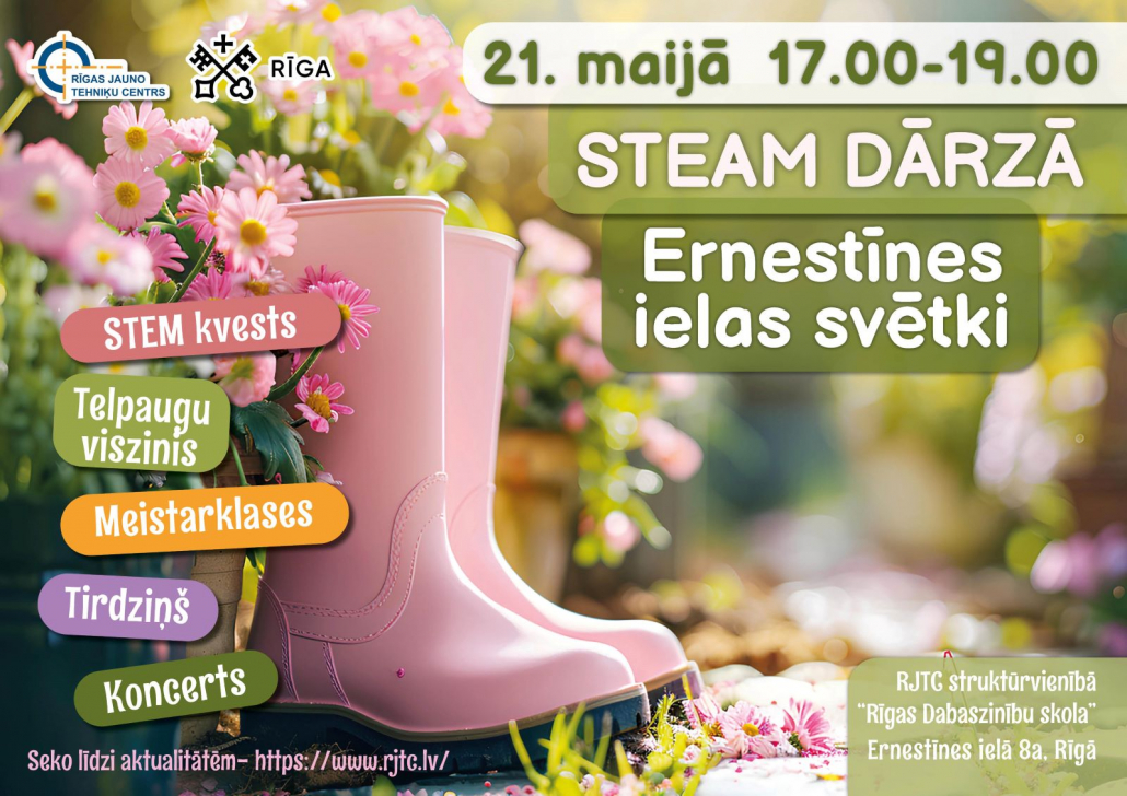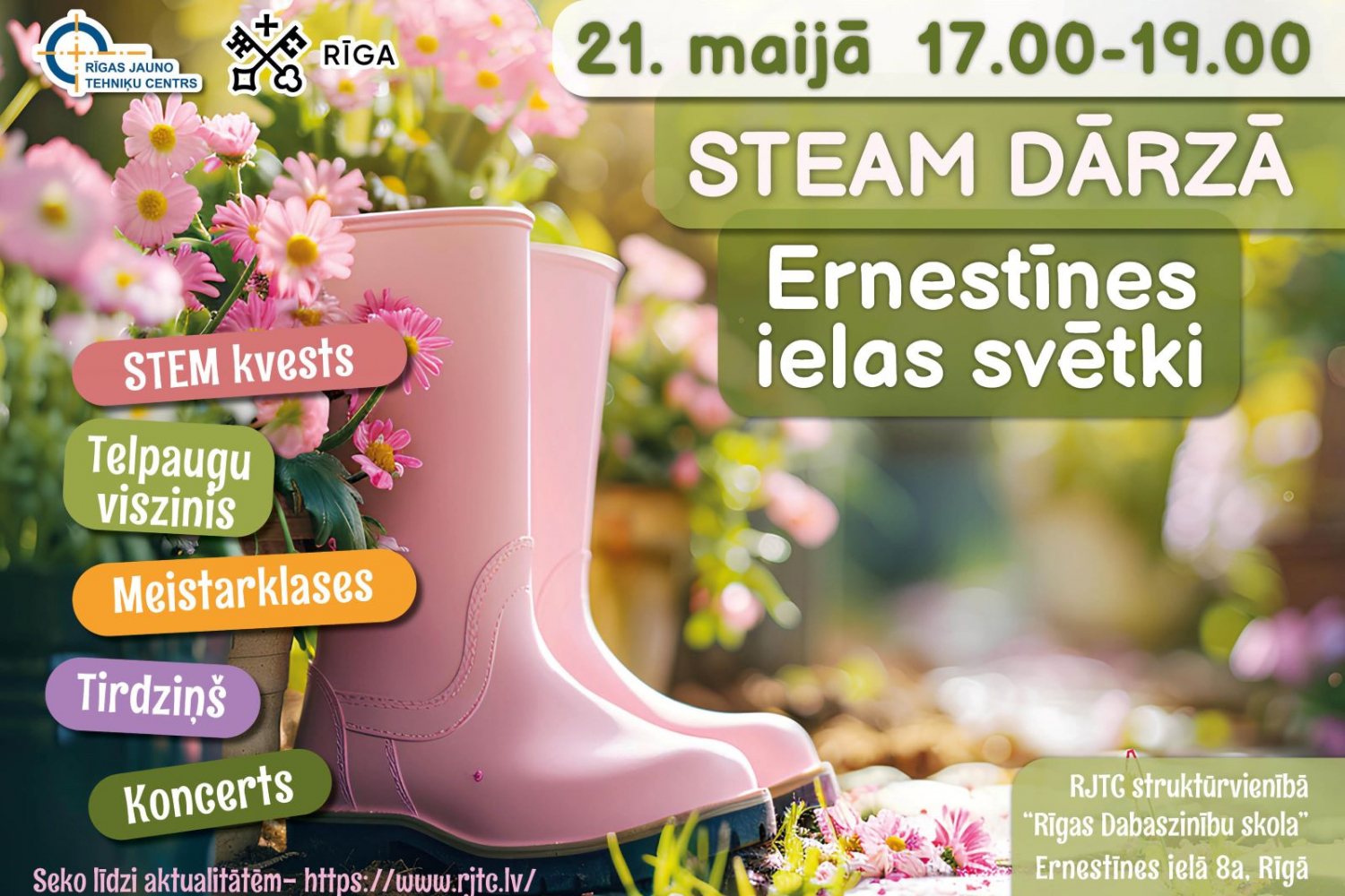 Rīgas Jauno tehniķu centrs (RJTC) sadarbībā ar Rīgas pašvaldības Izglītības, kultūras un sporta departamentu aicina ikvienu interesentu piedalīties “STEAM dārzā- Ernestīnes ielas svētkos”, kas norisināsies 21. maijā no plkst. 17.00 līdz 19.00, Ernestīnes ielā 8A.