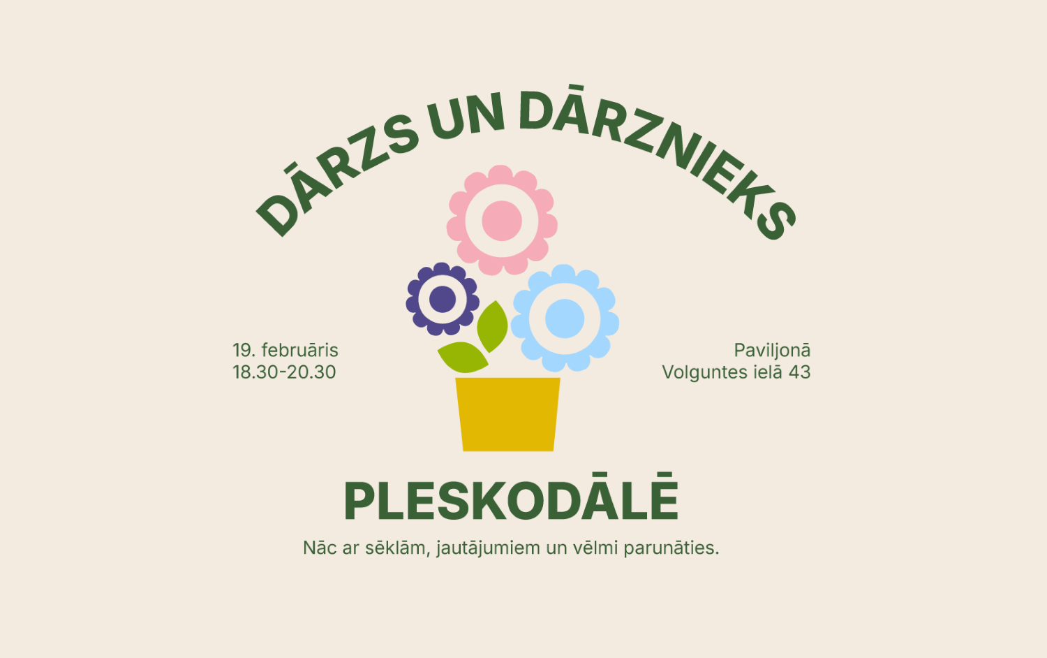 Ziema tuvojas beigām, līdz ar to arī sarunu tēma pavisam pavasarīga – Dārzs un dārznieks Pleskodālē – sarunas par dārziem, stādiem, kaimiņu sadarbību un praktiskiem jautājumiem. Aicinām ikvienu nākt ar sēklām, jautājumiem un vēlmi dalīties pieredzē.