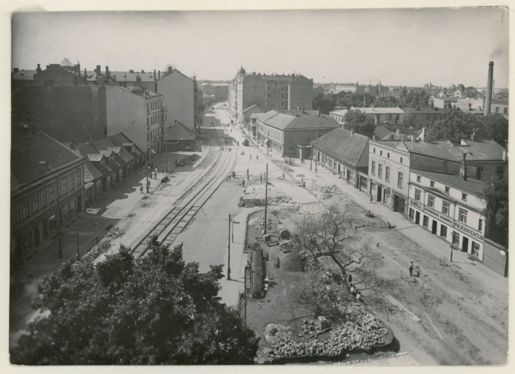 Skats no Jaunās Svētās Ģertrūdes baznīcas (celta 1903. – 1906. gadā pēc arhitekta Vilhelma fon Strika projekta) torņa, iemūžinot Brīvības ielas apbūvi un ielas seguma maiņu – no bruģa uz asfaltu (foto autors Rob. Johansons, 1939. gads)