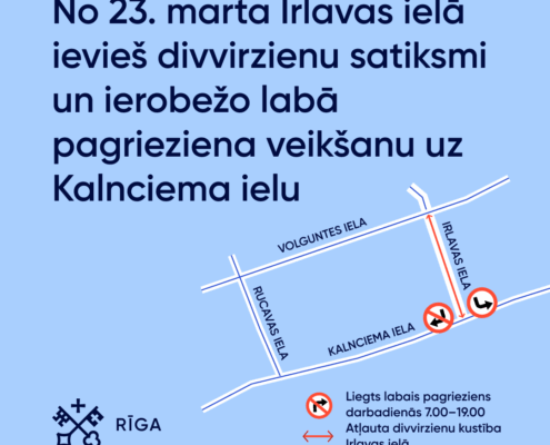 Pleskodāle, ŠampēterisNo 23. marta Irlavas ielas posmā starp Volguntes ielu un Kalnciema ielu ieviesīs satiksmes organizācijas izmaiņas, nosakot divvirziena kustību līdzšinējās vienvirziena kustības vietā.