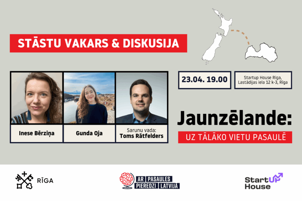 Projekta pirmajā pasākumā runāsim par valsti, kas atrodas vistālāk no Latvijas – Jaunzēlandi. Tas notiks 23. aprīlī, pl. 19.00, Startup House Riga telpās (Lastādijas iela 12 k-3, Rīga). Sarunā piedalīsies Inese Bērziņa un Gunda Oja, kas dzīvojušas Jaunzēlandē. Sarunu moderēs RSU docētājs un Latvijas Ārpolitikas institūta pētnieks Toms Rātfelders.