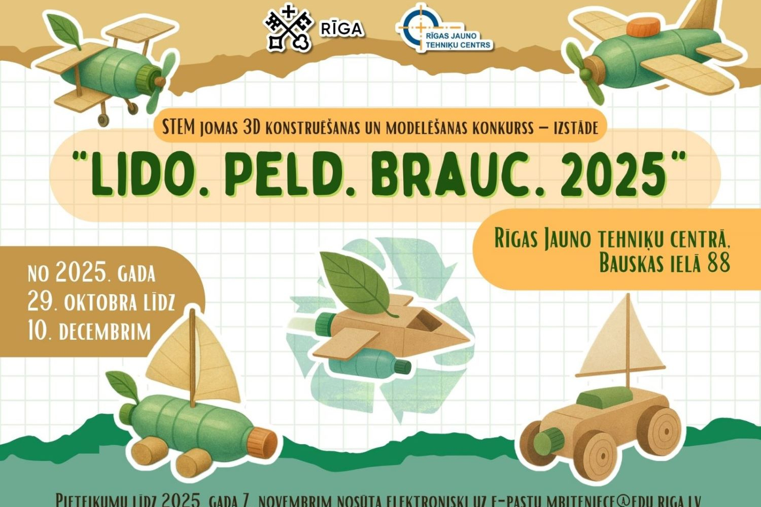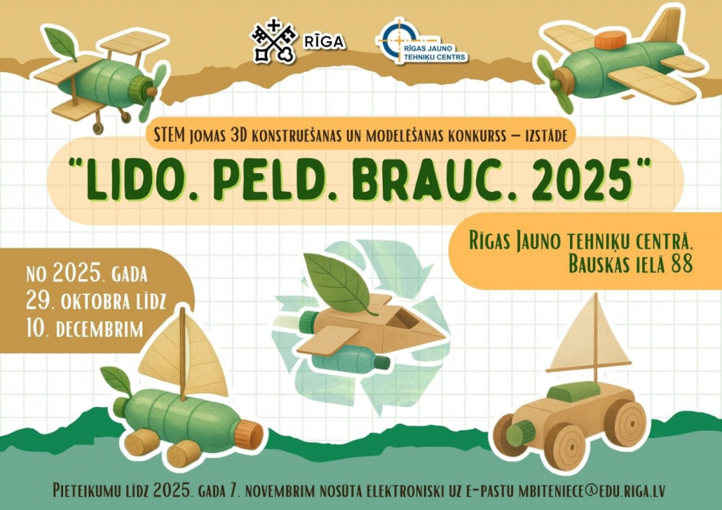 Rīgas Jauno tehniķu centrs aicina Rīgas skolu un interešu izglītības iestāžu bērnus un jauniešus piedalīties STEM jomas konstruēšanas un modelēšanas konkursā – izstādē “Lido. Peld. Brauc. 2025”, kas notiks no 2025. gada 29. oktobra līdz 10. decembrim.