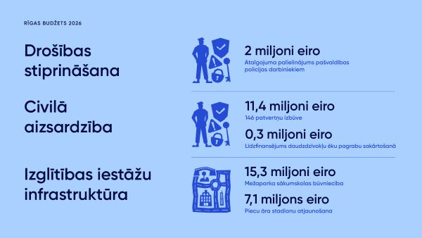 “Viena no manām prioritātēm būs drošības stiprināšana Rīgā. Šogad palielināsim Rīgas pašvaldības policistu atalgojumu par diviem miljoniem eiro, par 16% palielinot kārtībniekiem, par 8% – 10% inspektoriem. 2026. gada sākumā tiks pabeigts investīciju projekts policijas vienotā vadības un videonovērošanas centra izveidei Lēdurgas ielā 26, lai nodrošinātu augstākas reaģēšanas spējas krīzēs. Savukārt civilās aizsardzības jomā paredzēts kopā ar valsts finansējumu attīstīsim un labiekārtosim 146 pašvaldības patvertnes, kā arī uzsāksim līdzfinansējuma programmu daudzdzīvokļu ēku pagrabu sakārtošanā,”