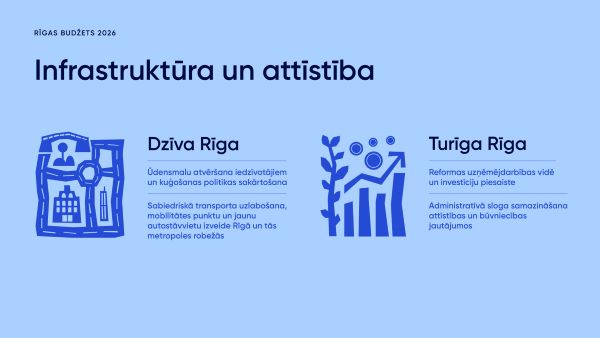 Rīgas pašvaldība 2026. gadā plāno vairāk nekā 200 miljonu eiro investīcijas izglītībā, transporta nozarē un pilsētvides attīstībā. No šī apjoma 78 miljoni eiro paredzēti nozīmīgu infrastruktūras projektu īstenošanai, tostarp Vanšu, Jorģa Zemitāna un Gaisa tilta atjaunošanai, kā arī Kundziņsalas pārvada un Dienvidu tilta 4. kārtas būvniecībai. Savukārt 5,3 miljoni eiro tiks novirzīti pilsētvides labiekārtošanai un gājēju drošības uzlabošanai — paredzēts ierīkot 20 jaunas gājēju pārejas, uzlabot 40 esošās, izveidot piecas drošas skolas zonas un attīstīt jaunu veloinfrastruktūru.